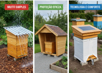 - Escolha do local: Instale as caixas em áreas cobertas ou sob telhados, evitando que a chuva atinja diretamente as colmeias. Se não for possível, use coberturas impermeáveis acima das caixas.